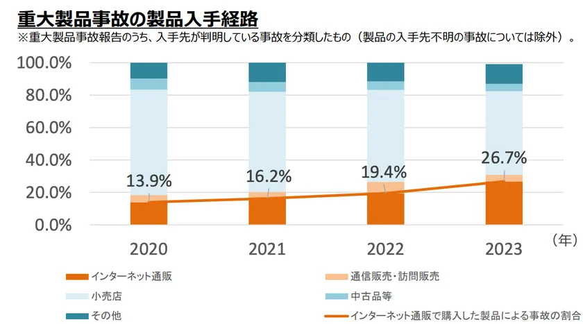 2021年及び2022年の製品起因による事故は約3割。中でも、インターネット通販で購入した製品による重大事故の割合は増加傾向で、2021年~2023年でみると、346件。このうちリチウム電池などの電気製品が、上位8品目で188件(54.3%)を占めるという結果になりEC市場の拡大とともに事故件数も年々増加しています。
