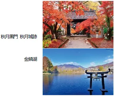 ・竈門神社、太宰府天満宮、宗像大社、秋月城跡、金鱗湖、みょうばん湯の花、