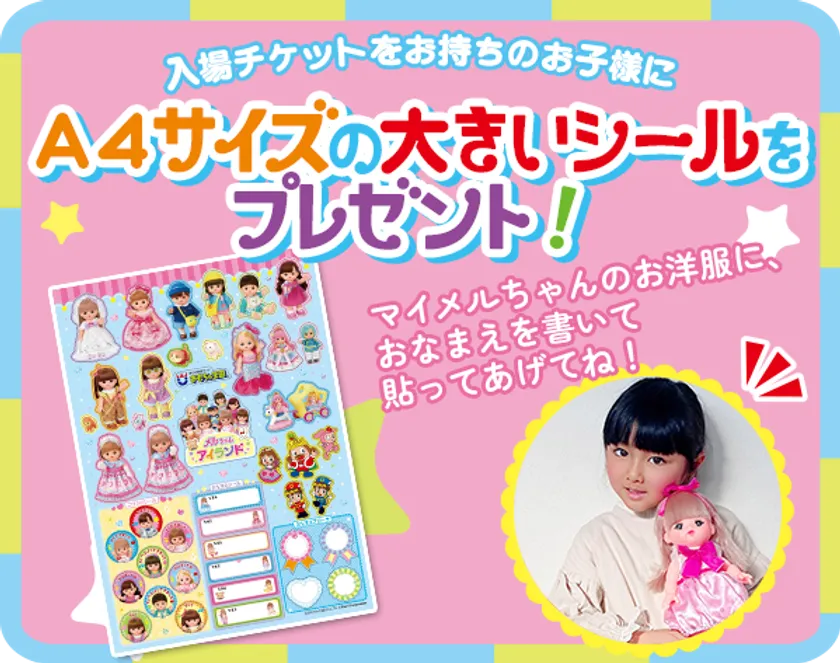 入場チケットをお持ちのお子様には、メルちゃんのA4サイズの大きいシールをプレゼントします。