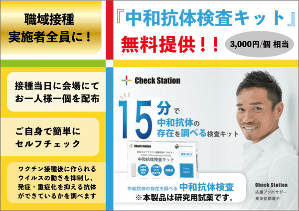 職域接種会場において、弊社の新型コロナ検査サービス「Check Station」で展開している中和抗体検査(3,000円相当)を全員に無償提供いたします。