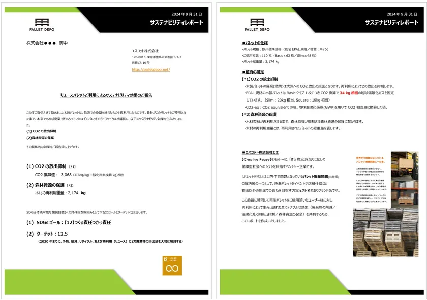 エスコットではレンタルユーザーに対し、パレット再利用によって生み出されるサステナビリティ効果を数値化した「サステナビリティレポート」を提出しています。レポート項目は以下の3項目です。