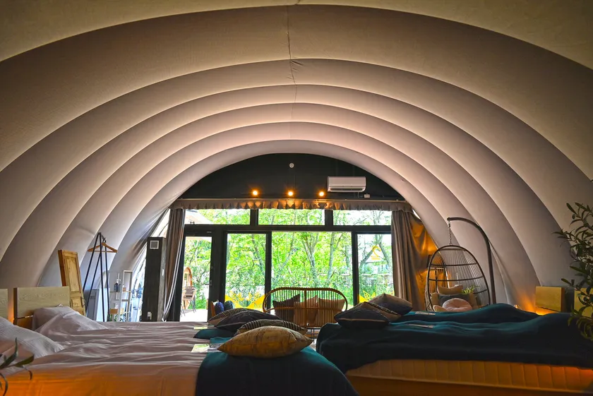 全棟に天然温泉風呂をご用意した高規格仕様のグランピング施設。愛犬同伴可能な開放感を感じるコクーンテント、直径7mの大空間が広がるドームテント、いずれも年中快適にお過ごしいただける冷暖房完備。カップルや家族、グループでもご利用いただきやすい1棟貸切仕様の為、気兼ねなくお過ごしいただけます。