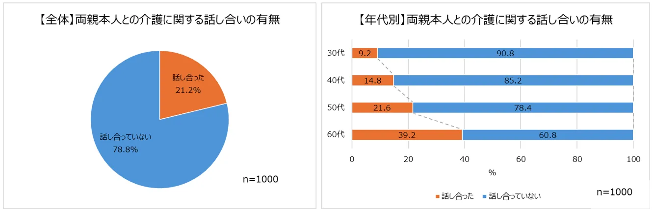少子高齢化が進む日本では、医療や介護人材の不足など様々な問題を抱えています。身近なところでは、まず両親の介護について考える機会がある人が多いのではないでしょうか。親子間(※義父母を含む)で親世代の介護について話し合ったことがあるか質問したところ、「話し合った」と回答したのは、2割程度(21.2%)。約8割(78.8%)は話し合っていないことが分かりました。年代別で見てみると、話し合っている人は、両親の年齢も比較的若い30代で1割以下(9.2%)、年代が上がるにつれて割合は高くなっているものの、親の年齢が80~90代と考えられる60代でも4割を下回りました(39.2%)。親の介護が身近な世代でも、介護について話し合えていない人が多数派という結果に。