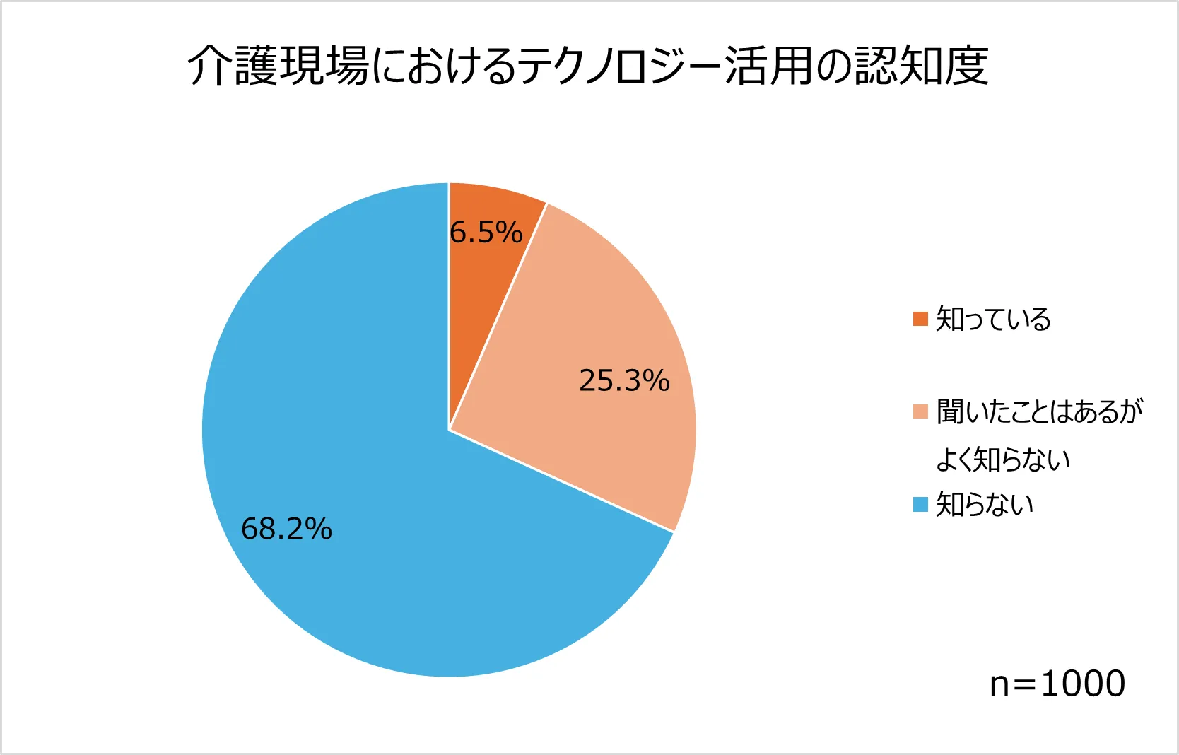 介護現場でデータやテクノロジーが活用されていることに対する認知度は、「知っている(6.5%)」と回答した人はわずかでした。「聞いたことはあるが、よく知らない(25.3%)」および「知らない(68.2%)」と回答した人は9割以上(93.5%)。介護現場におけるテクノロジー活用は、まだほとんど知られていないことが明らかになりました。