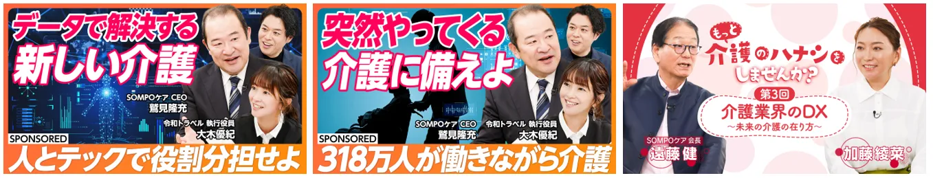 当社の「未来の介護」の取組みをより多くの人に知ってもらえるよう、ウェブメディア「未来の介護MAGAZINE」を公開しました。本調査リリースのほか、弊社代表取締役社長 鷲見が出演した国内最大級ビジネス動画メディアである「PIVOT」の動画、介護関連の資格を取得している加藤綾菜さんと、SOMPOケア相談役会長 遠藤との対談動画などのコンテンツを掲載しています。