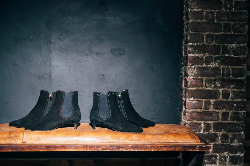 サイドゴア部分とヒールに赤ステッチを施しました。