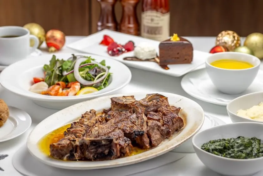 ランチには、シーフードをふんだんに使った前菜からスタートし、シェフ特製の季節のスープや、メインとして「仔牛のTボーンステーキ」をご堪能いただけます。デザートにはクリスマス限定デザート、イリィコーヒーまたはマイティーリーフ ダージリンティーをご用意しております。最後まで大満足のクリスマス特別ランチコース(全5品)です。
