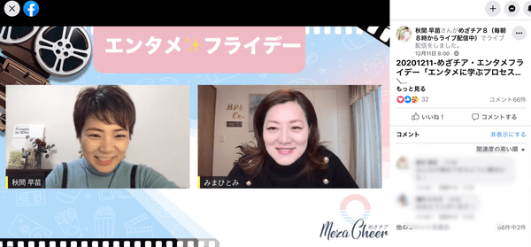 参加者9000人越え日本最大規模の朝活オンラインサロン「めざチア」にて、各種ビジネスプロデュースを手がける女性起業家・三間瞳さんと、教育・環境・医療などの新規事業創成を支援する社会事業プロデューサー・秋間早苗さんによる、楽しむを超えたエンタメ大解剖の毎週金曜朝8時からの朝ライブが大好評。