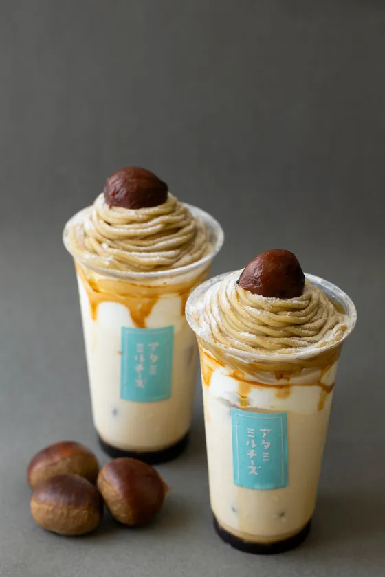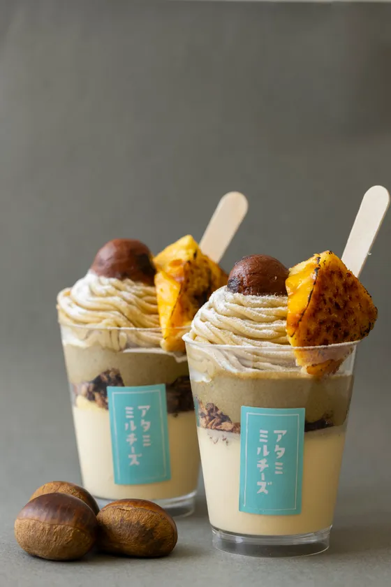 熱海ミルチーズが贈る秋限定メニューのテーマは「栗」。和栗をふんだんに使った「モンブランバスク」「バスクパフェモンブラン」「のめるモンブラン」の3商品をご用意しました。パフェや「のめるモンブラン」は、和栗を使ったクリームなど多様な素材を幾層にも重ねることで、最後まで飽きることなくお楽しみいただけるよう仕上げています。