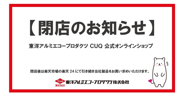 東洋アルミエコープロダクツ株式会社(所在地:大阪市西区、代表取締役社長:酒井大典)は、2025年9月30日をもちまして、当社が運営する楽天市場の公式オンラインショップ「東洋アルミエコープロダクツ CUQ」を閉店することをお知らせいたします。長年にわたりご愛顧いただいたお客様には心より感謝申し上げます。