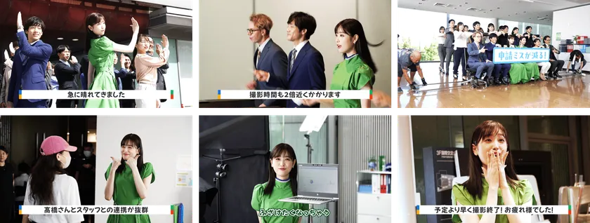 当日はあいにくの曇り空…と思いきや、撮影が始まったとたん快晴に!前回に続いて晴れ女ぶりを発揮した髙橋さん。今回は大人数で動きを合わせる難しいシーンが続くうえに、二人の髙橋さんが登場するということで撮らなければいけないカットも2倍…そんな大変な撮影でも笑顔を絶やさず、「ついついふざけたくなっちゃう(笑)」と多彩なアドリブで現場を和ませてくれました。サービス精神とやさしさに溢れる髙橋さんの姿をお楽しみください!
