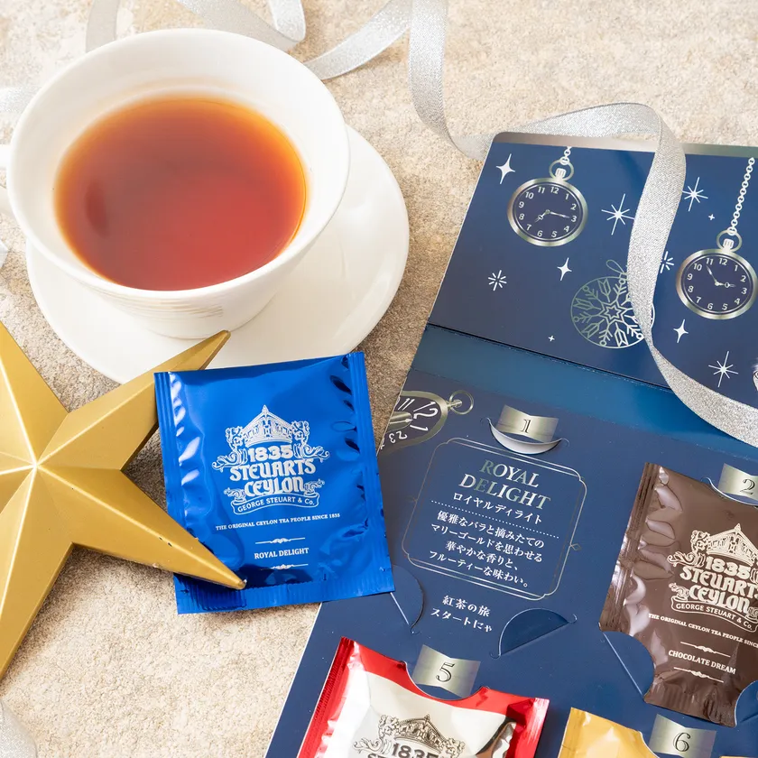 本商品は、スリランカ最古の紅茶ブランド「ジョージスチュアートティ」とのコラボレーションから生まれた、24種類の紅茶を日替わりで楽しめる特別なアドベントカレンダーです。