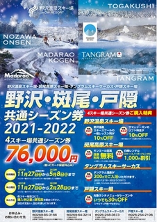 長野県北部にある4スキー場(野沢温泉スキー場、斑尾高原スキー場、戸隠スキー場、タングラム)ではエリア全体での集客強化、国際競争力の高いスノーリゾートを目指すことを目的に連携、リフトの共通シーズン券を販売、9月15日より各スキー場HPにて購入申込用紙を掲載する。