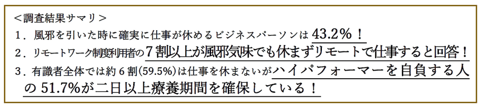 リモートワーカーの7割以上が風邪気味でも 休まずリモートで仕事をすると回答! ハイパフォーマーほど風邪の療養期間が長いと判明!