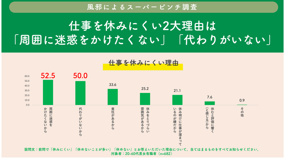 第二弾となる今回は、ビジネスパーソンが風邪を引いた時に、どの程度の方が実際に休みを取得できているのかを調査で明らかにしました。結果からは、半数以上のビジネスパーソンが“休みにくい”と感じており、“周りに迷惑をかけてしまうのでは?”や“代わりがいない”などの理由から休みを取得しにくい状況が垣間見えました。