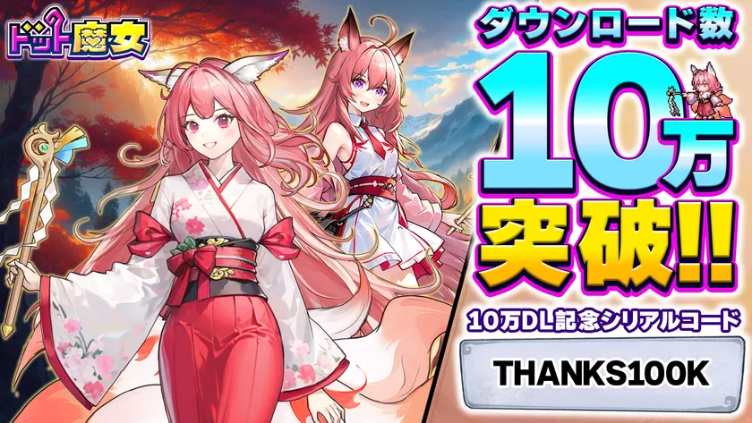 SEVEN&EIGHT HOLDINGS株式会社(所在地:東京都港区)は、スマートフォンゲーム『ドット魔女』が配信開始から累計10万ダウンロードを突破したことをお知らせいたします。この10万ダウンロード達成を記念して、期間限定でゲーム内アイテム「ダイヤ1000個」がもらえるシリアルコードをプレゼントするキャンペーンを開催します。シリアルコードの入力方法など、詳しい情報はアプリ内のお知らせや公式SNSをご確認ください。