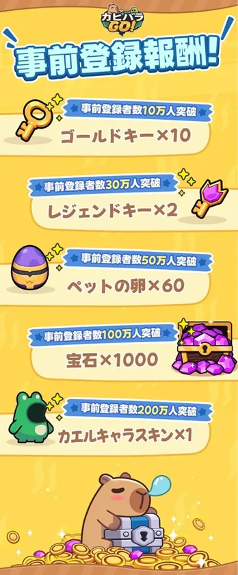 『カピバラ Go!』では、事前登録を受付中です。登録者数に応じて豪華な特典をプレゼントいたします!