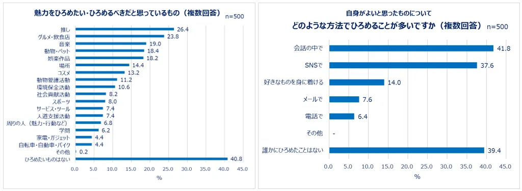 今、女性たちが魅力をひろめたい・ひろめるべきだと思っているものを聞きました。その結果1位は「推し(26.4%)」、2位は「グルメ・飲食店(23.8%)」、3位は「音楽(19.0%)」で、「ひろめたいものはない(40.8%)」と回答した人を除き、約6割の人はひろめたい・ひろめるべきだと思っているものがあるとわかりました。「動物愛護活動(11.2%)」や「環境保全活動(10.6%)」、「周りの人(魅力・行動など)(6.8%)」と回答した人もおり、活動や行動を含む幅広いジャンルに票が入りました。ひろめる方法は「会話の中で(41.8%)」「SNSで(37.6%)」と回答した人が特に多い結果となりました。「誰かにひろめたことはない(39.4%)」と回答した人を除き、6割以上は自身がよいと思ったものについて、誰かにひろめているようです。