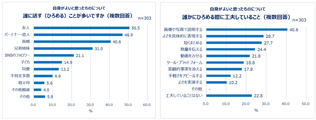 ひろめる相手は「友人(50.5%)」「パートナー・恋人(46.9%)」「両親(40.6%)」が上位でした。また、ひろめる際の工夫としては「画像や写真で説明する(40.6%)」「よさを具体的に表現する(28.7%)」といった意見がありました。