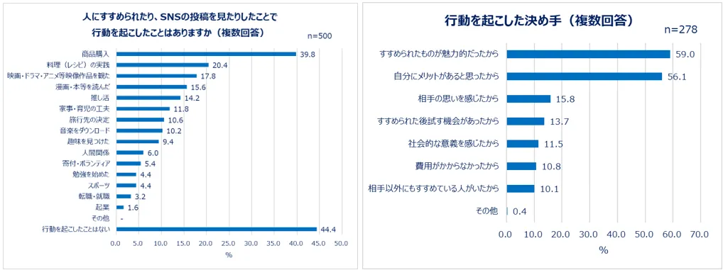誰かにすすめられて、自分自身の行動が変化した経験についても聞きました。その結果、半数以上が行動を起こした経験があることがわかりました。「商品購入(39.8%)」のほか、「料理(レシピ)の実践(20.4%)」「家事・育児の工夫(11.8%)」「寄付・ボランティア(5.4%)」など幅広い行動に票が入りました。行動を起こした決め手は「すすめられたものが魅力的だったから(59.0%)」「自分にメリットがあると思ったから(56.1%)」が上位に。すすめられたものを素直によいと感じ、実践した人が多いとわかります。
