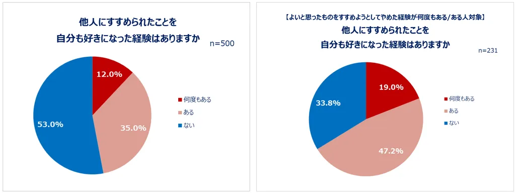 一方すすめようとしてやめた人も「否定されるのが怖い」。 人にすすめられたものを好きになった経験がある人は約半数!