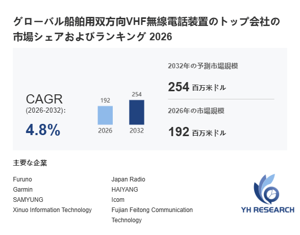 YHResearch調査チームの最新レポート「グローバル船舶用双方向VHF無線電話装置のトップ会社の市場シェアおよびランキング 2026」によると、2026年の192百万米ドルから2032年には254百万米ドルに成長し、2026年から2032年の間にCAGRは4.8%になると予測されています。