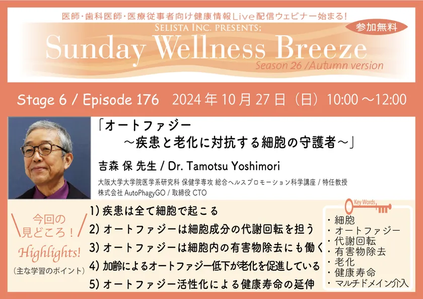 セリスタ株式会社(東京都千代田区、代表取締役:伊藤 承正)は、2024年10月27日(日)に、吉森 保 先生(大阪大学大学院医学系研究科 保健学専攻 総合ヘルスプロモーション科学講座 / 特任教授)を講師にお迎えし、医師・歯科医師などの医療従事者向け無料Zoomオンラインセミナー『オートファジー ~疾患と老化に対抗する細胞の守護者~』を開催します。