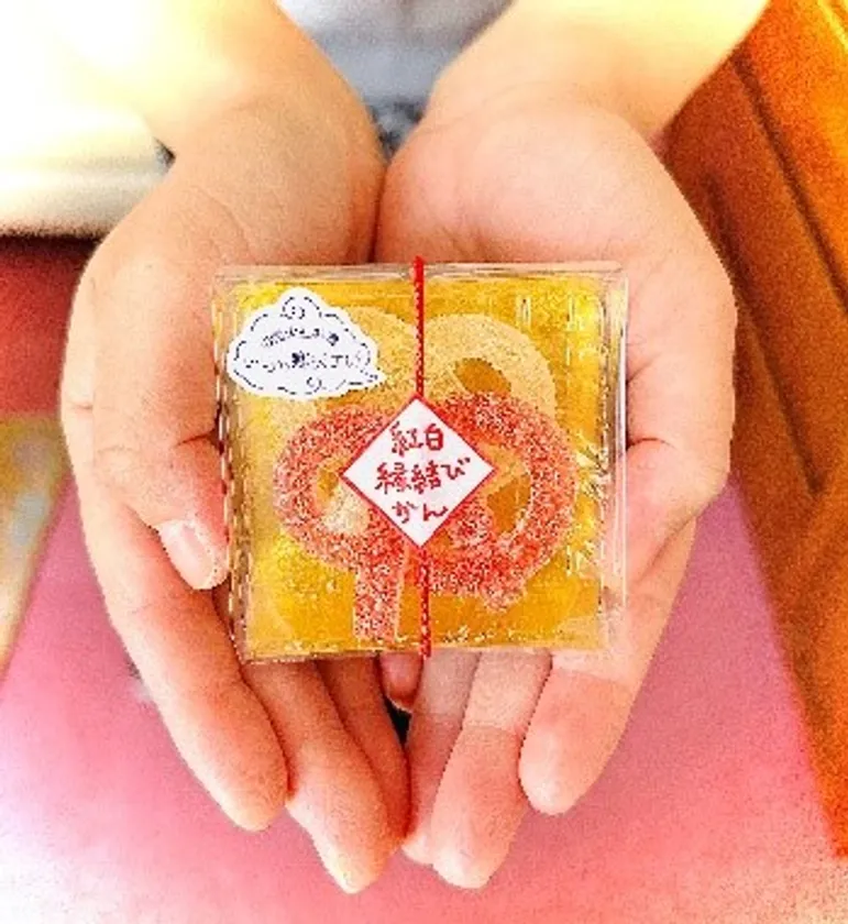 縁起の良い紅白2色(あまおう苺・あかりんご)のぜりいを出雲の縁結びにちなんで、水引のようにひとつひとつ手作業で結っています。