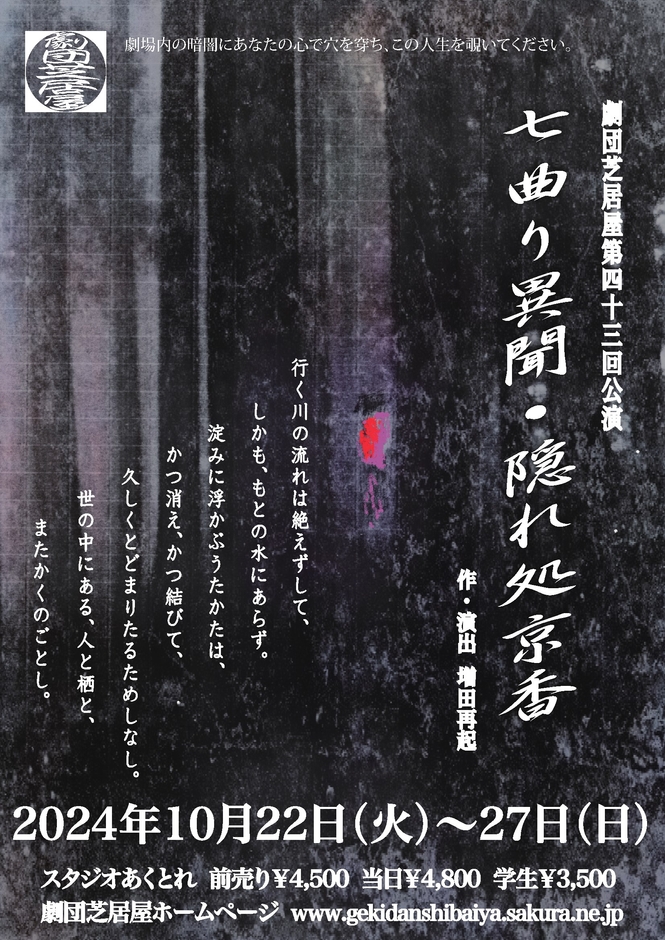 劇団芝居屋第43回公演『七曲り異聞・隠れ処京香』が2024年10月22日 (火) 〜 2024年10月27日 (日)に中野スタジオあくとれ(東京都中野区中野2丁目11-2 サン中野マンションB1)にて上演されます。