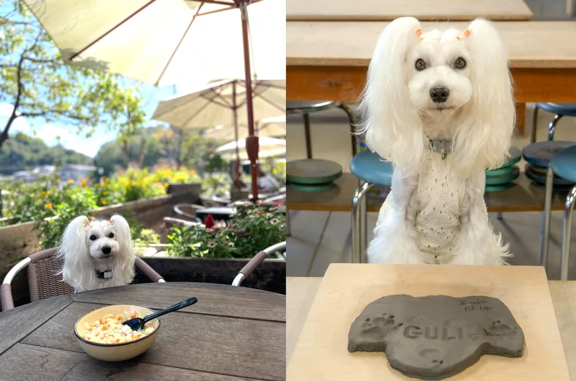ペット同伴OKのカフェや陶芸体験(2,750円)、ドッグラン(有料)も楽しめる。キャリーに乗せて一緒にショッピングも可能。