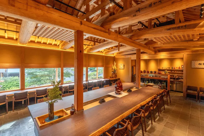 店内に足を踏み入れると、京都 「離世」の蛤の貝殻を原材料とした高級な胡粉のれん、そして銘木「鉄刀木」(たがやさん)の一枚板が客席テーブルとして鎮座しています。宮大工が1年以上かけて建築したという天井の高い建物で、大黒柱と恵比寿柱には昔から高貴とされる一位(いちい)の木を使い、壁は信楽の土を使った独自の土壁で仕上げました。店内の床に使われている美しい陶板も大小屋の蛇窯で焼いたもので、日本らしい「白銀比」の縦横比。一位の木や杉をふんだんに使用した店内は日本の伝統建築美を追求しており、極めて精巧で、店内に一歩足を踏み入れると、まるで禅寺の静けさと和の美しさに包まれるような特別な空間を感じていただけます。