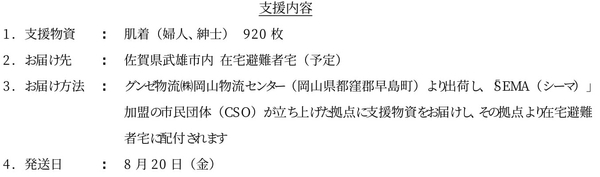 グンゼ株式会社(本社:大阪市北区、社長:佐口 敏康)は、今回災害にみまわれた地域の皆さまに対し、緊急災害対応アライアンス「SEMA(シーマ)*」の要請により以下の通り支援を実施いたしました。