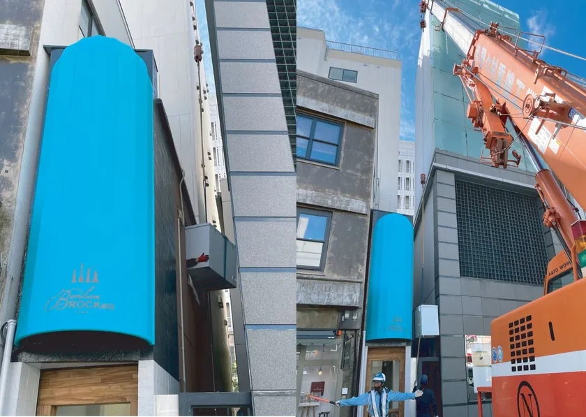 2Fに設置した什器類は、1Fの階段からは上げられず、クレーン屋さんにお願いをして搬入しています。