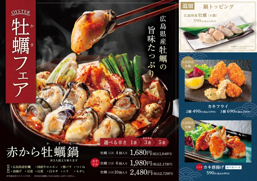寒さが深まる冬、旨味が増した旬の牡蠣を贅沢に使用した牡蠣鍋をメインに、「赤から」らしい旨辛な牡蠣料理も楽しめるフェアです。