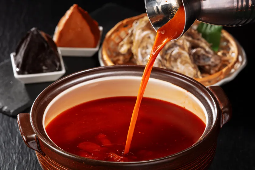 「赤から牡蠣鍋」のために開発した専用の特製スープ。具材の牡蠣の旨味がより味わえる渾身の鍋スープ