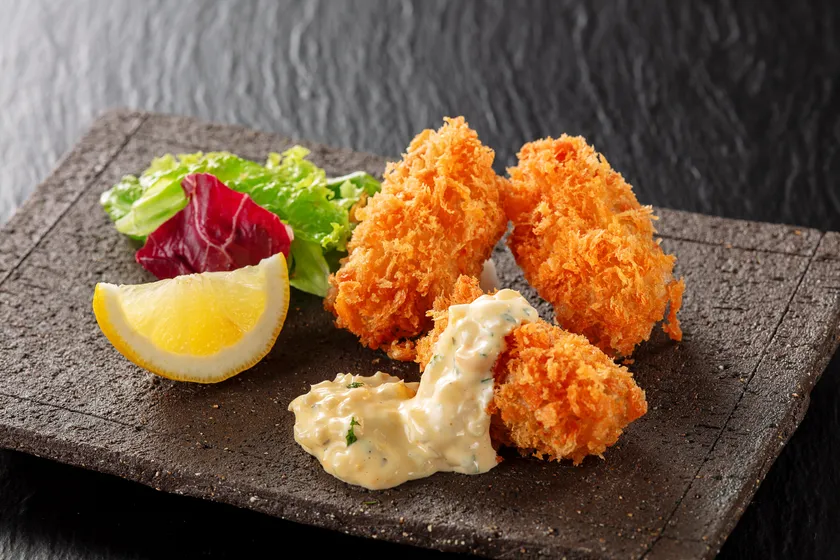熱々のカキフライは外がサクサクっと、中はふわっとした食感でミルクのような芳醇な牡蠣本来の味わいが口いっぱいに広がる定番の一品。