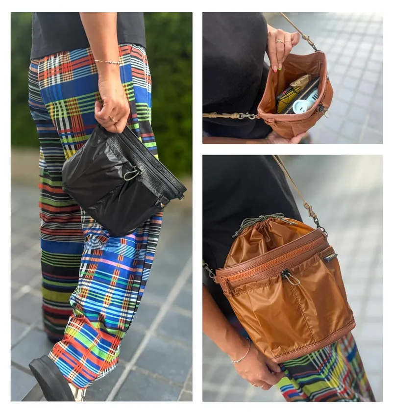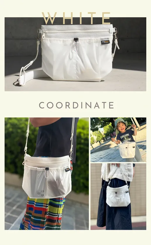 ・機能性/サコッシュといえばシンプルで必要最低限のモノがしまえる小型のバッグをイメージします。ミニマリストが流行する昨今では見かけることが多いアイテムです。「出かけるときは財布とスマホが入ればいい」私もその中の一人です。しかし、そのスタイルでは飲み物を購入しただけで手に持ってブラブラ、小物を購入しては、もれなくレジ袋を用意する事になります。「その問題をどうにかしたい!」この思いからたどり着いたのが拡張するスタイルでした。底マチを拡張する事でペットボトルが入るサイズに変化!さらに縦方向に拡張する事で小物も入るサイズに変化!!