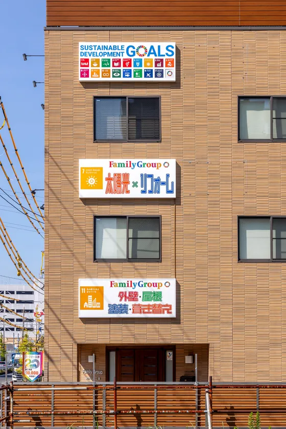 ファミリーグループでは家庭用の太陽光発電の普及に取り組んでおります。地球温暖化の原因の一つである二酸化炭素を出さず、地球のどこでも手に入れることができるクリーンなエネルギーは持続可能な未来にとって欠かせません。一人でも多くのお客様に太陽光発電の素晴らしさを理解していただき、導入していただけるように努めてまいります。また、ファミリー工房 足立本社(足立区大谷田4-1-20)の正面と側面には、同内容のLED発光看板を設置し、太陽光、蓄電池、V2H、エコキュート等の太陽光発電の積極的な普及活動を表しました。