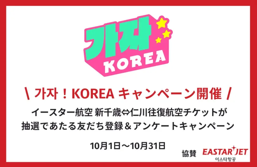 北海道新聞社が運営する韓国に興味のある人なら誰でも参加できる「韓国LOVEコミュニティ」を作るプロジェクト「カジャ!コリア」は、2024年10月31日まで、イースター航空で行く新千歳-仁川の往復航空券が当たる「カジャ!コリア」友だち登録&アンケートキャンペーンを実施中です。