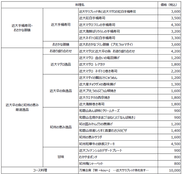 【<参考>近大卒の魚と紀州の恵み 近畿大学水産研究所 大阪・関西万博 ウォータープラザ店 提供メニュー一覧】