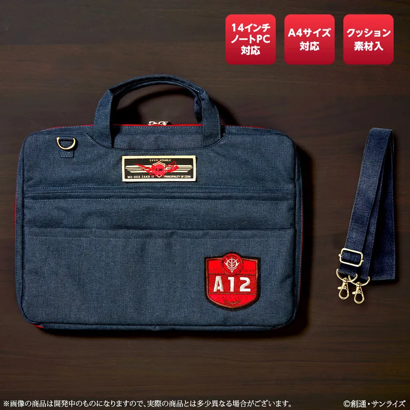 「シャア専用PCケース」はレピア織と刺繍のワッペンがミリタリー感を演出しつつも、ビジネスシーンで使いやすい落ち着きあるカラーリングにまとめました。