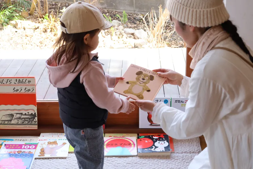 新たな絵本との出会いがきっと生まれる「kinarico」の絵本交換会・読み聞かせは、肌寒い秋にぴったりな薪ストーブスペースのそばで開催されます。(薪ストーブの稼働は当日の気温によります)