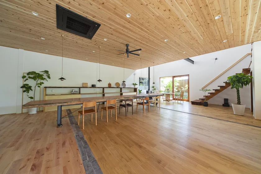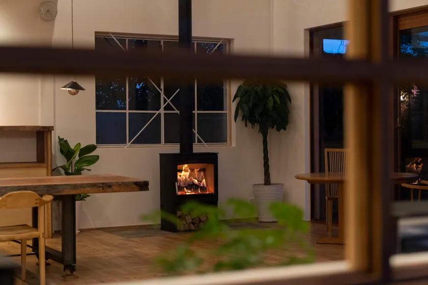 イベントが開催される会場は、無垢材や漆喰などの自然素材にこだわり住む人に寄り添った設計を行う宇治の工務店「ITAYA KOBO」のショールーム。木の香りが心地いい古工場をリノベーションした広々空間にはイートインスペースを設置。約6mの一枚板テーブルは圧巻で一見の価値あり!屋内にある薪ストーブの美しい炎を眺め身体の芯から暖まりながらフードをお楽しみいただけます。屋外は宇治の山々を望む自然いっぱいの庭スペースで多数の出店を予定。ベンチ近くに薪ストーブを設置しているので、屋外でも炎を眺めて癒されること間違いなし。ITAYA KOBOスタッフにお声がけいただくと新築注文住宅やリノベーションなどのお家相談も可能です。お家をご検討中の方には、出入り自由でショールームをご見学いただける本イベントがオススメ。