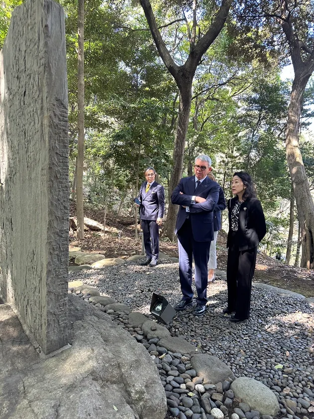 大使館の庭園の石碑を眺める大使