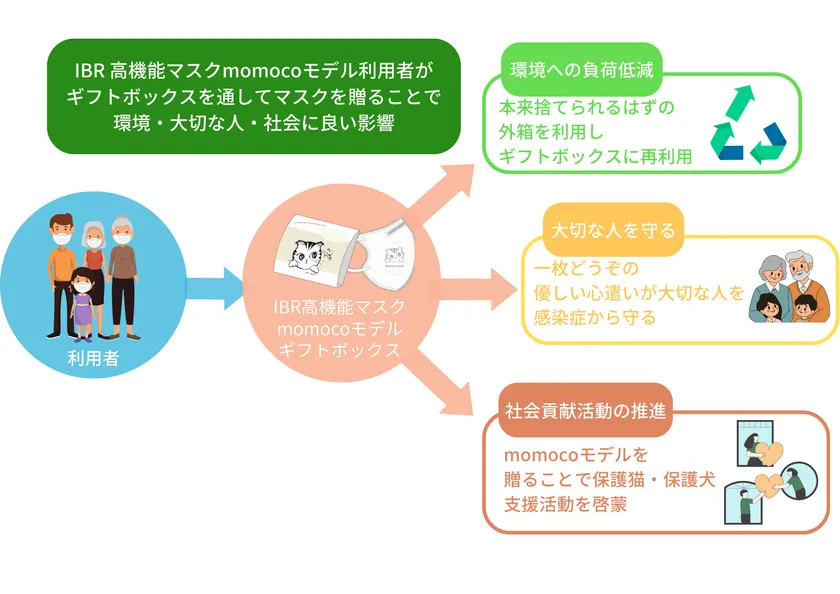 今回、パッケージをリニューアルした「IBR高機能マスクmomocoモデル」は、本来捨てられるはずだった外箱がギフトボックスにアップサイクルされるため、ゴミの削減と同時に環境への負担低減となります。また、身近な人に一枚どうぞのやさしい心遣いが自然と生まれ、大切な人を高機能マスクで感染症から守り、保護猫・保護犬支援活動の啓蒙にもつながります。
