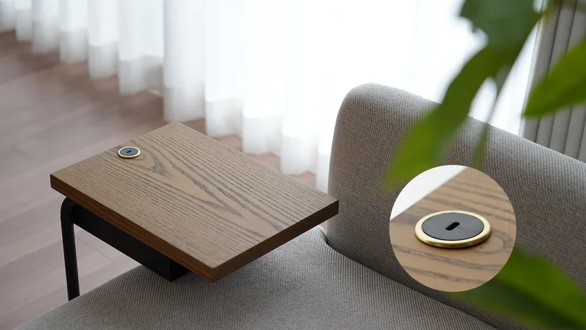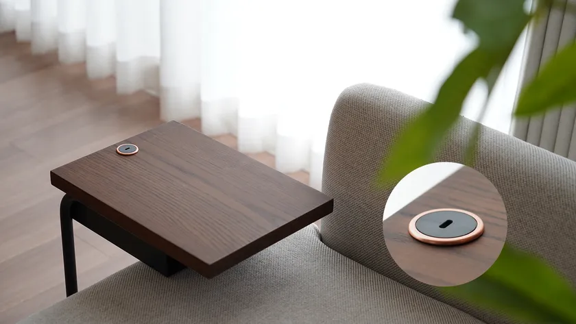 従来の充電タップや埋め込み型コンセントは、家具のデザインを損ねる場合が多いですが、「EXARM POWER 20 -SIDE TABLE-」は、天板にUSB-C電源を配置することで、すっきりとした美しい外観を保っています。目立たないサイド部分には100Vコンセントも設置し、用途に応じて使い分けが可能です。スマホや家庭用ゲーム機のワイヤレスコントローラーなど、各種デバイスの充電に役立ちます。
