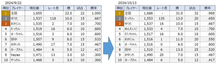 9月15日の大阪大会、9月22日の東京大会の対戦成績から共通レーティングで算出しています。今回、10月13日に開催された大阪大会の試合結果もデータ反映しています。