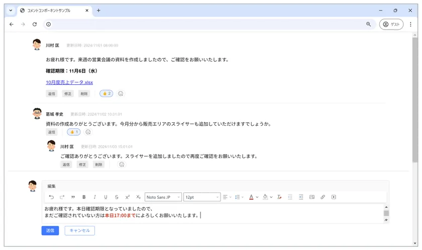 コメントコンポーネントにおけるコメントの入力エディタには標準HTML要素だけでなく、リッチテキストエディタコントロールなど、InputManJSの高機能なコントロールが使用できます。
