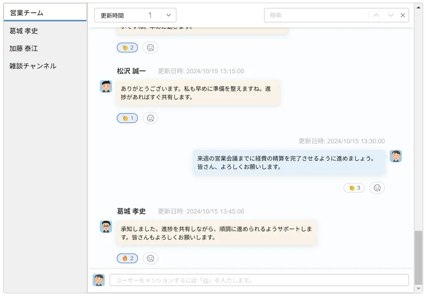 コメントコンポーネントをさまざまなUIコンポーネントと組み合わせて使うことで、コラボレーションツールのような情報共有のためのアプリケーションが開発できます。デモサイトでは「Wijmo(ウィジモ)」( https://developer.mescius.jp/wijmo )の「TabPanelコントロール」( https://demo.mescius.jp/wijmo/demos/Nav/TabPanel/Overview/purejs )を利用した、社内のコミュニケーション用チャットアプリケーションのサンプル(※)も公開いたします。