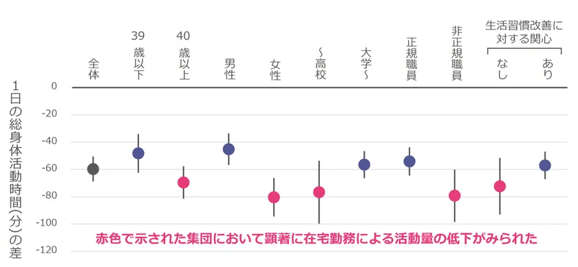 ◎在宅勤務に関連した活動量の低下は、性別、年齢層、教育歴、生活習慣改善に対する関心の有無により異なる傾向が見られました。